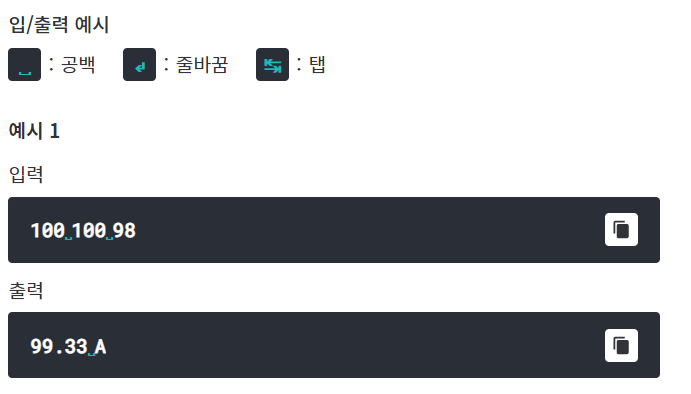 100 100 100이 입력된 예시2의 경우 프로그램 실행값이 (100.00 A)가 아니라