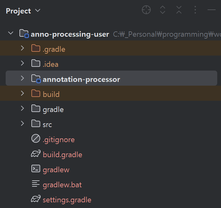 어노테이션을 정의하고 처리하는 기능을 담당하는 모듈(annotation-processor)과 커스텀 어노테이션을 사용할 모듈(anno-processing-user)이다. 우리가 일반적으로 롬봄을 사용할 때 의존성을 추가하는 구성과 동일하다고 보면 된다.