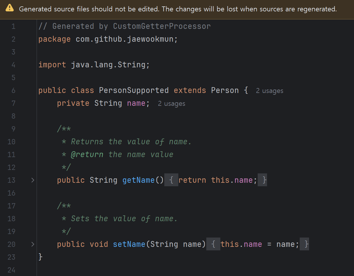 커스텀 어노테이션을 적용한 뒤 인스턴스 필드만 선언하고 프로젝트를 빌드하면 getter, setter가 추가된 클래스가 생성된다.