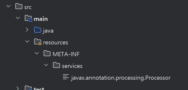 @AutoService를 사용하지 않을 경우 src/main/resources/META-INF/services/javax.annotation.processing.Processor 파일을 생성하여 해당 파일에 직접 Processor 이름(패키지 경로까지 포함)을 표기해야한다.