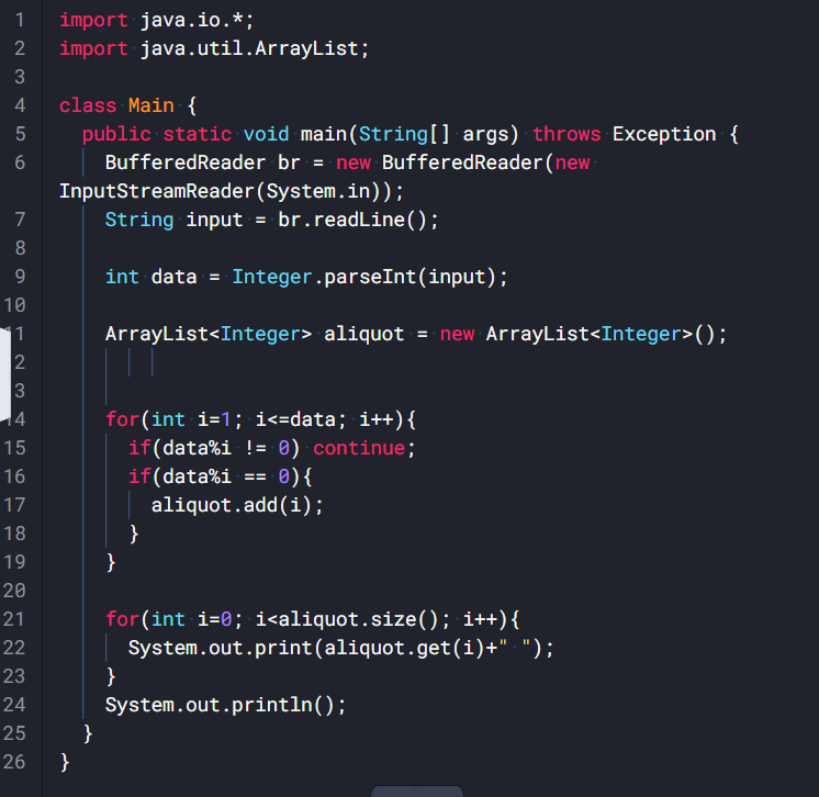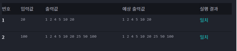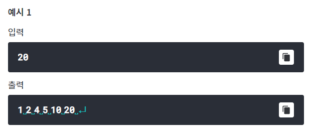 입력 : 양의 정수 출력 : 입력된 수의 약수를 공백으로 구분하여 출력