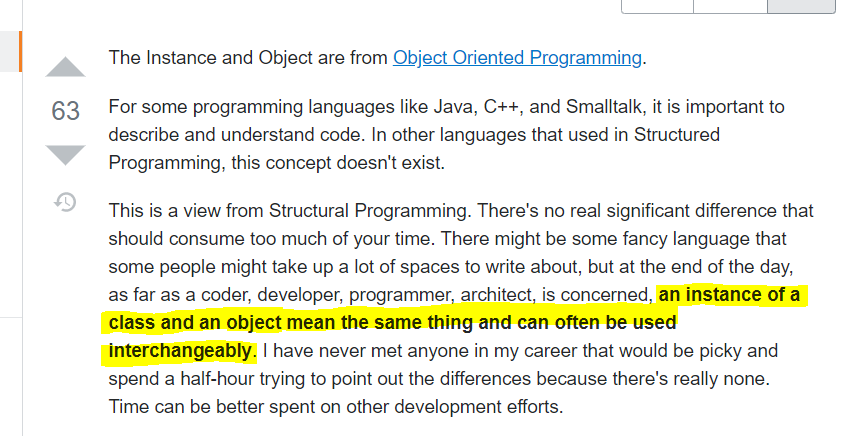StackOverflow에서 인스턴스와 객체의 차이를 묻는질문에 대한 답변 중 가장 많은 추천을 받은 답변이다.
